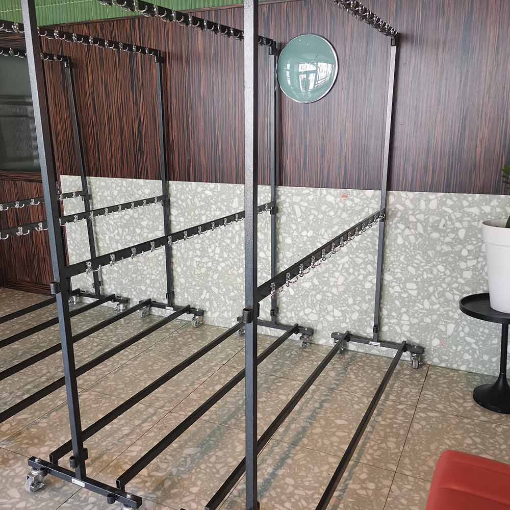 Riidestange on ratastel 104 konksuga ning ülemisel ja alumisel real on 52 konksu. Mõõdud: 192 x 200cm Riidestangesid on võimalik omavahel ühendada ning riidepuude riputamiseks saab stangel vahetada konksud sileda ümmarguse toru vastu.