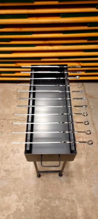 Grillvannil on eemaldatavad jalad ja mahub ilusti sõiduautosse. Grillvanniga on kaasas 11 grillvarrast. Vanni mõõdud 70xm x 18cm sügavus 15cm Vann tuleb tagastada puhastatult Soovi korral puhastame grilli ise – lisandub 8€
